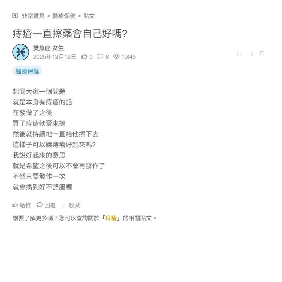 我媽她其實已經被痔瘡 困擾一段時間了 只是一直很害怕動手術 聽說術後會蠻痛的 看完之後其實會有點替她擔心 另外我也有點在意 就是不知道 之後會不會又容易復發 畢竟誰也不想反覆受罪 想請問有經驗的人實際狀況 讓我們可以多一點參考 看更多