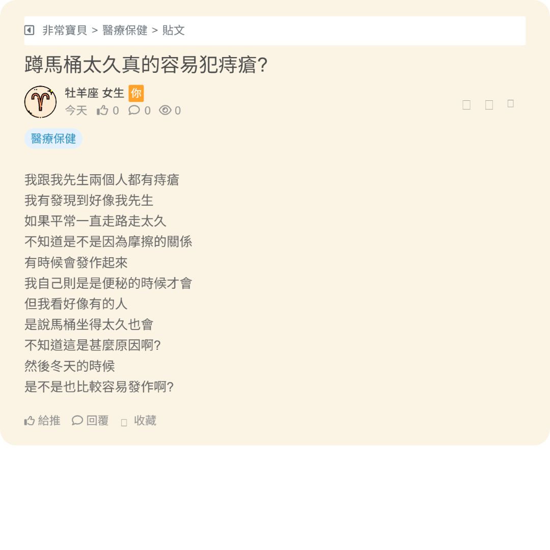 產後大概第二週開始覺得屁股怪怪的, 一開始還覺得想說好啦應該一陣子就會消吧, 結果都三個月了, 還是會脹脹痛痛, 有時候上廁所還出血…… 上次醫生有...