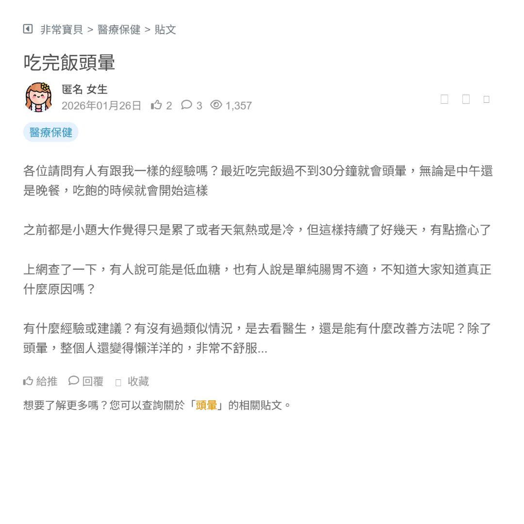 各位請問有人有跟我一樣的經驗嗎?最近吃完飯過不到30分鐘就會頭暈,無論是中午還是晚餐,吃飽的時候就會開始這樣