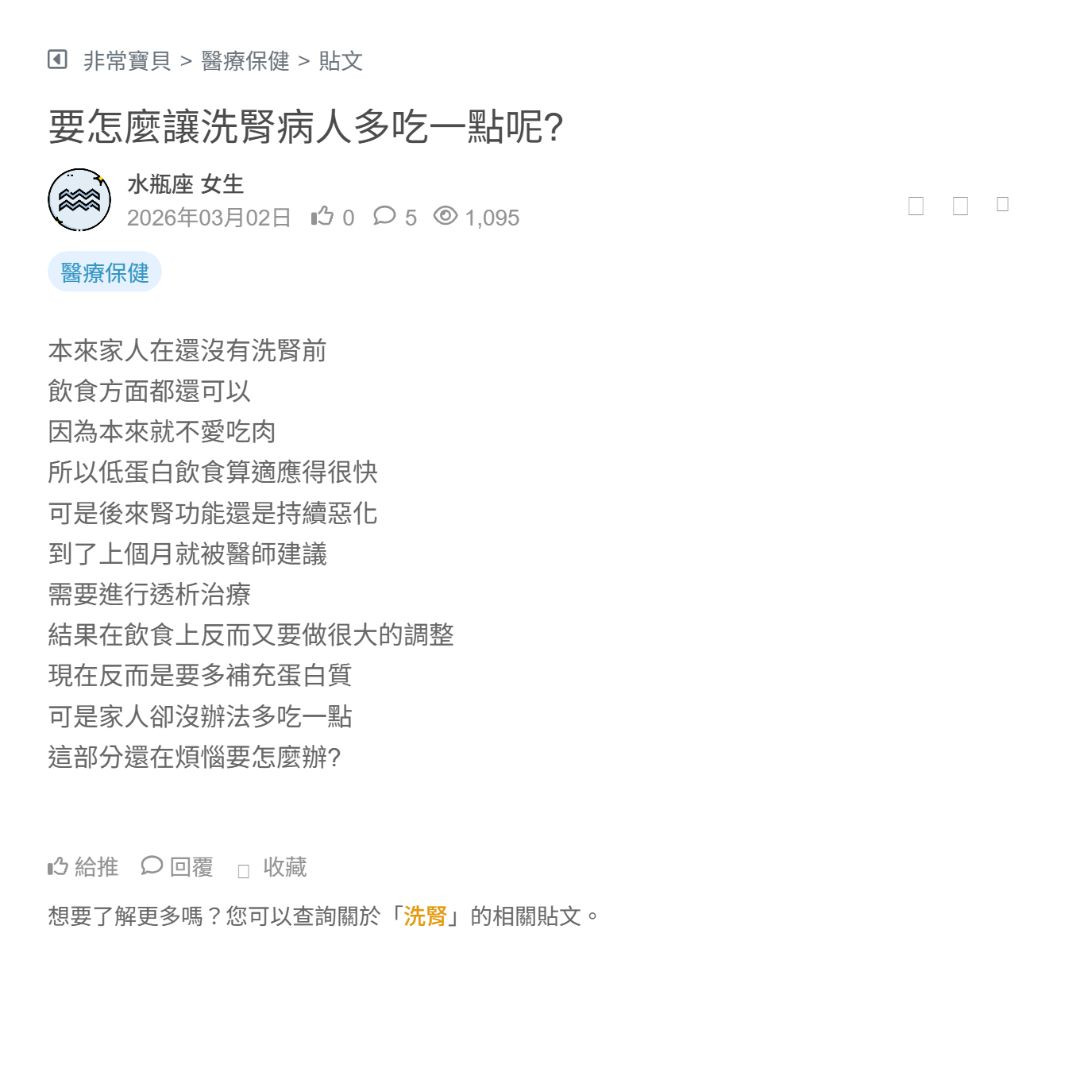最近家人剛開始洗腎 說真的整個過程比我想像的還要需要調適 以前他至少還會出去散步 偶爾陪我們逛個超市但開始固定洗腎後 我明顯感覺到體力掉很快 走一小段路就會喘、吃東西也吃不多 整個人看起來就是容易累 雖然醫生說剛開始洗腎本來就需要一段時間讓身體習慣 可是身為家屬看到還是會忍不住擔心 也不知道是不是營養不夠 還... 看更多