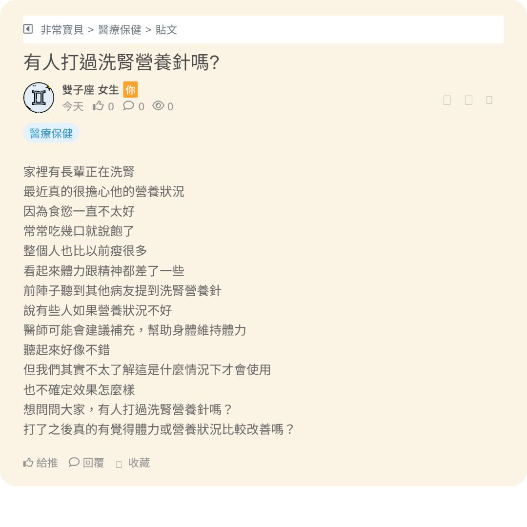 本身是一個想比較多的人 像最近家人固定在洗腎 但是被醫師建議 目前的一個身體指數不太好 讓我們考慮打營養針 乍聽之下感覺打營養針 是可以直接給身體帶來營養是...