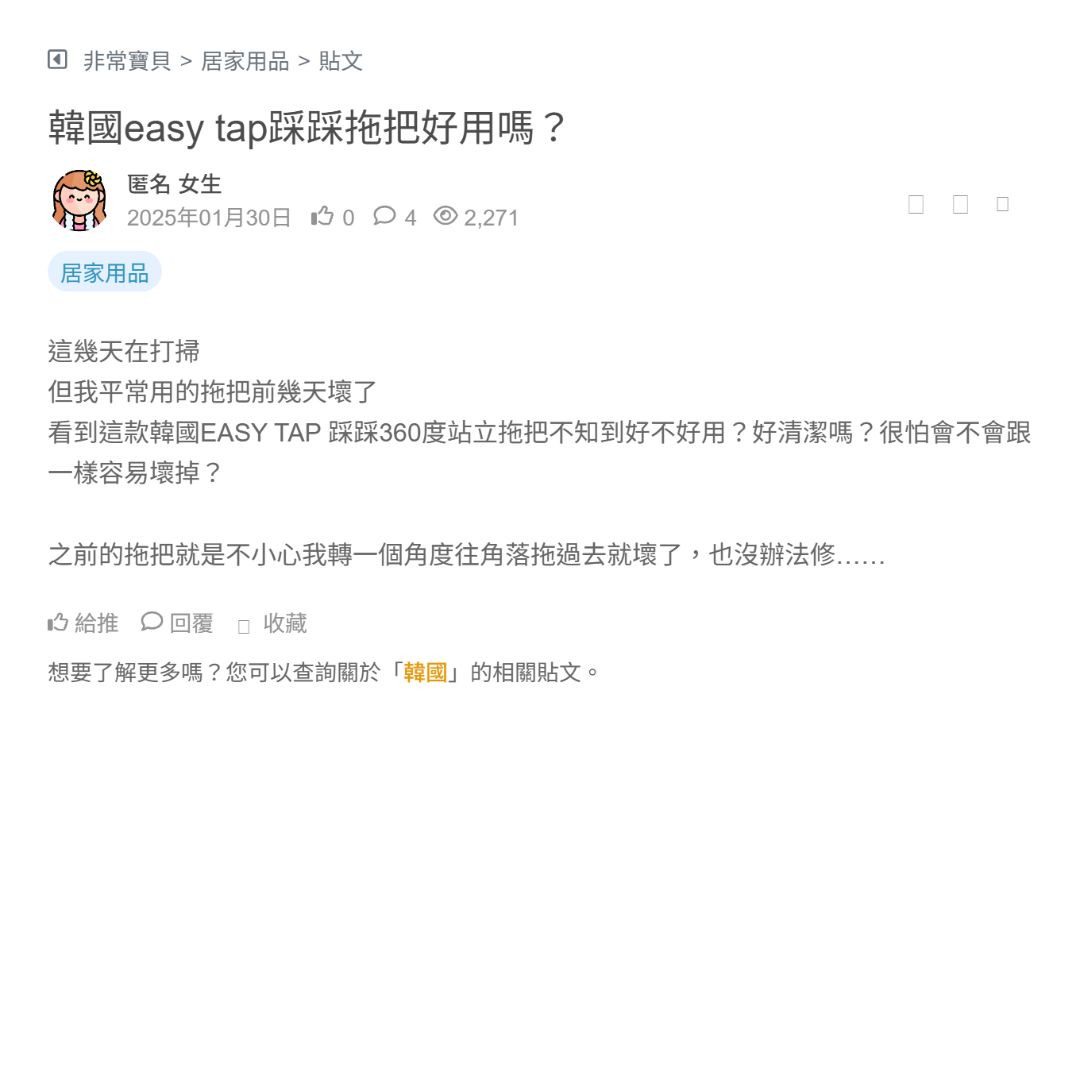 最近看到很多人推薦韓國的Easy Tap踩踩拖把 說它超級方便,拖地很省力又不累 就踩一踩就好? 目前我的疑問是,踩踩拖把真的那麼神奇?還是被網紅誇大?想知道優點和缺點是什麼? (之前有別的產品的購物經驗,也是被網紅推薦燒到,結果買回來超級不好用) 踩踩360度站立拖把+超細纖維魔術清潔布 價格也不便宜欸... 看更多