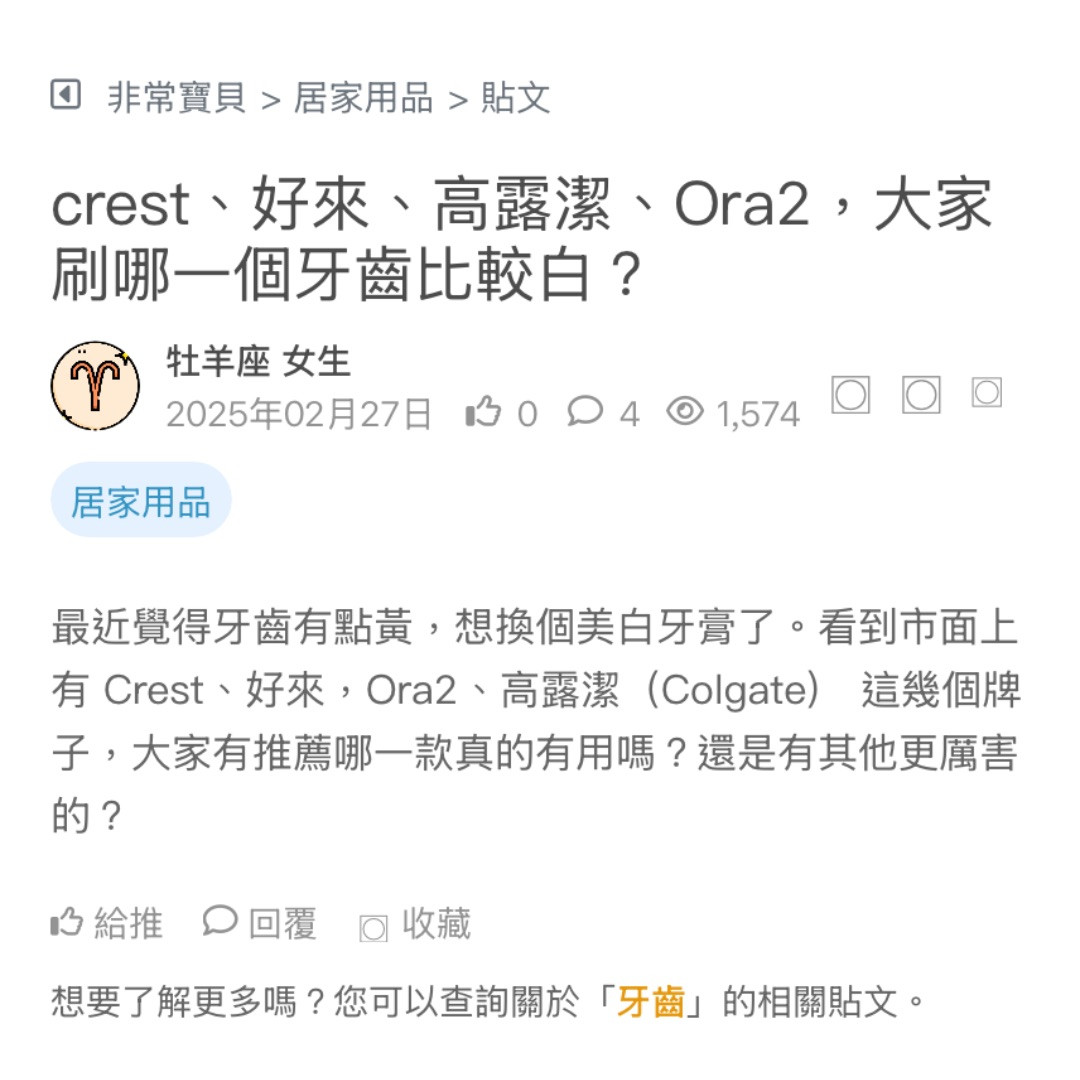 最近覺得牙齒有點黃,想換個美白牙膏了。看到市面上有 Crest、好來,Ora2、高露潔(Colgate) 這幾個牌子,大家有推薦哪一款真的有用嗎?還是有其他更厲害的?