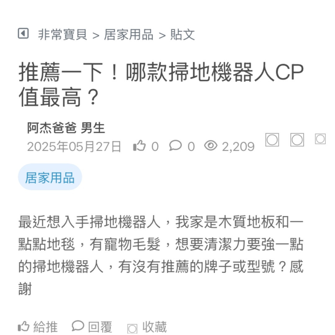 最近搬進一個小套房,想買掃地機器人,不知道哪款適合?我看了一下,有的主打靜音,有的強調吸力強 先說喔,我的套房沒有什麼高低落差,但地毯跟木地板都有,有推薦的品牌嗎? 因為預算有限,希望能買到CP值高的 感謝大家的建議! 看更多