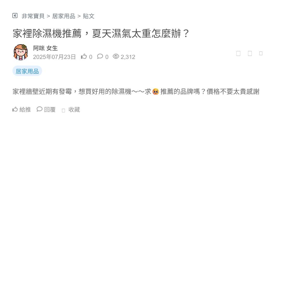 最近台灣天氣超濕熱 家裡牆壁都開始冒霉斑 想請問大家有沒有什麼居家除濕神器推薦? 除濕機好像價格落差很大 效果也差很多耶 有人用過那種不插電的吸濕包嗎? 真的有效嗎? 想買一台好用的除濕機,感謝大家分享推薦 謝謝 看更多