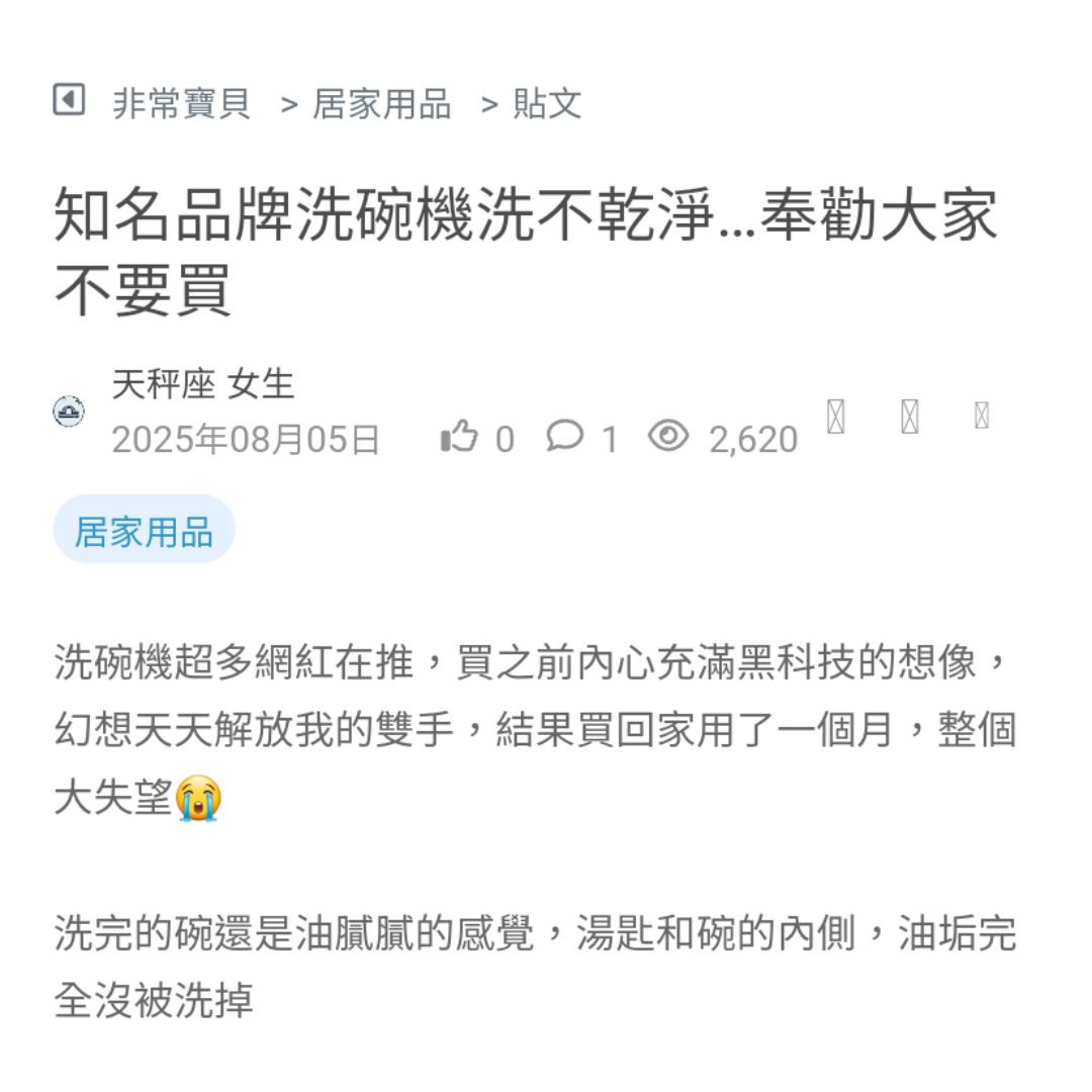 知名品牌洗碗機洗不乾淨…奉勸大家不要買