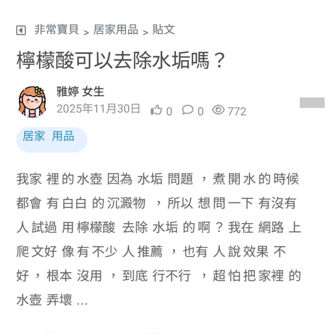 我家裡的水壺因為水垢問題,煮開水的時候都會有白白的沉澱物,所以想問一下有沒有人試過用檸檬酸去除水垢的啊?我在網路上爬文好像有不少人推薦,也有人說效果不好,根本沒用,到底行不行,超怕把家裡的水壺弄壞...