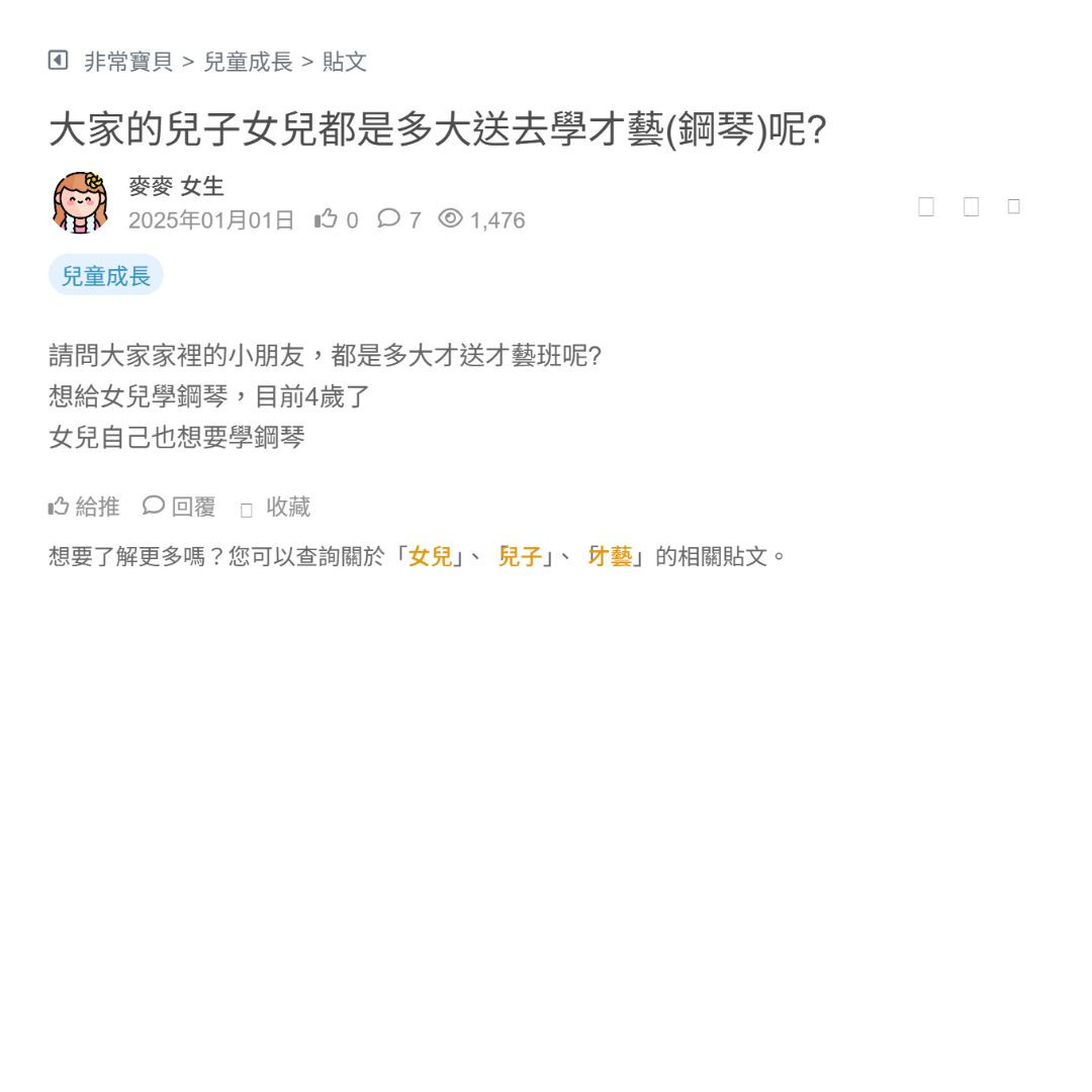 想給女兒上才藝班 先給她培養興趣 如繪畫、鋼琴還是其他課程 但不知道小孩能不能坐的住 怕上了又浪費一筆錢 顧慮到她可能想學但不一定有能力學… 要到適齡學會...