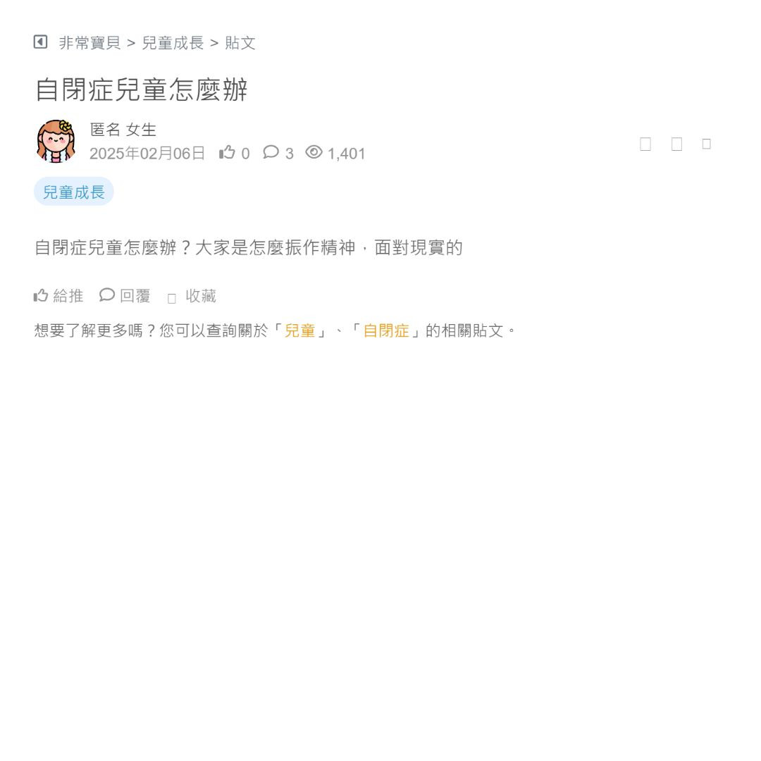 自閉症孩子不是沒救,我兒子剛開始不講話,後來用圖像溝通,現在已經能用簡單的句子表達需求了。加油 😭