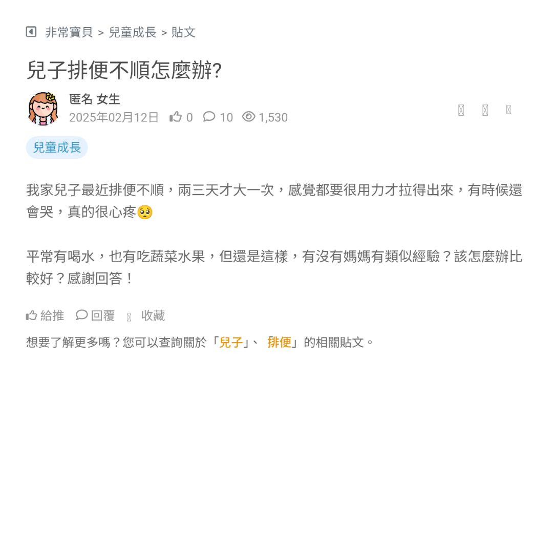 我家兒子最近排便不順,兩三天才大一次,感覺都要很用力才拉得出來,有時候還會哭,真的很心疼🥺