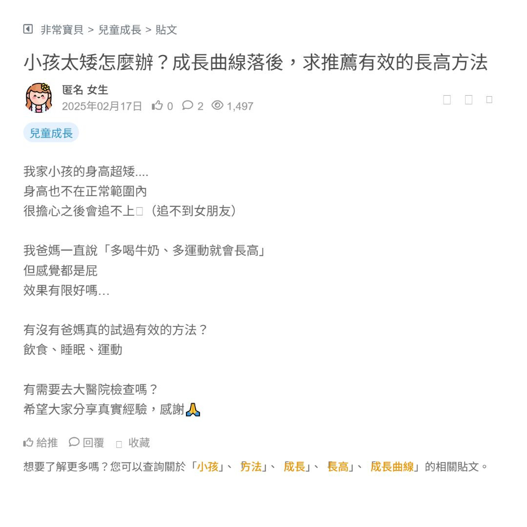 我家小朋友最近量身高,發現比同齡的朋友矮!! 真的有點擔心耶~家長有遇過這種狀況嗎? 醫生說每個小孩發育速度不一樣,有可能晚長高,但還是忍不住想多問問大家的經驗 是不是要補充什麼營養比較好?還是有什麼長高技巧 希望大家能分享一些實用的建議😭 看更多