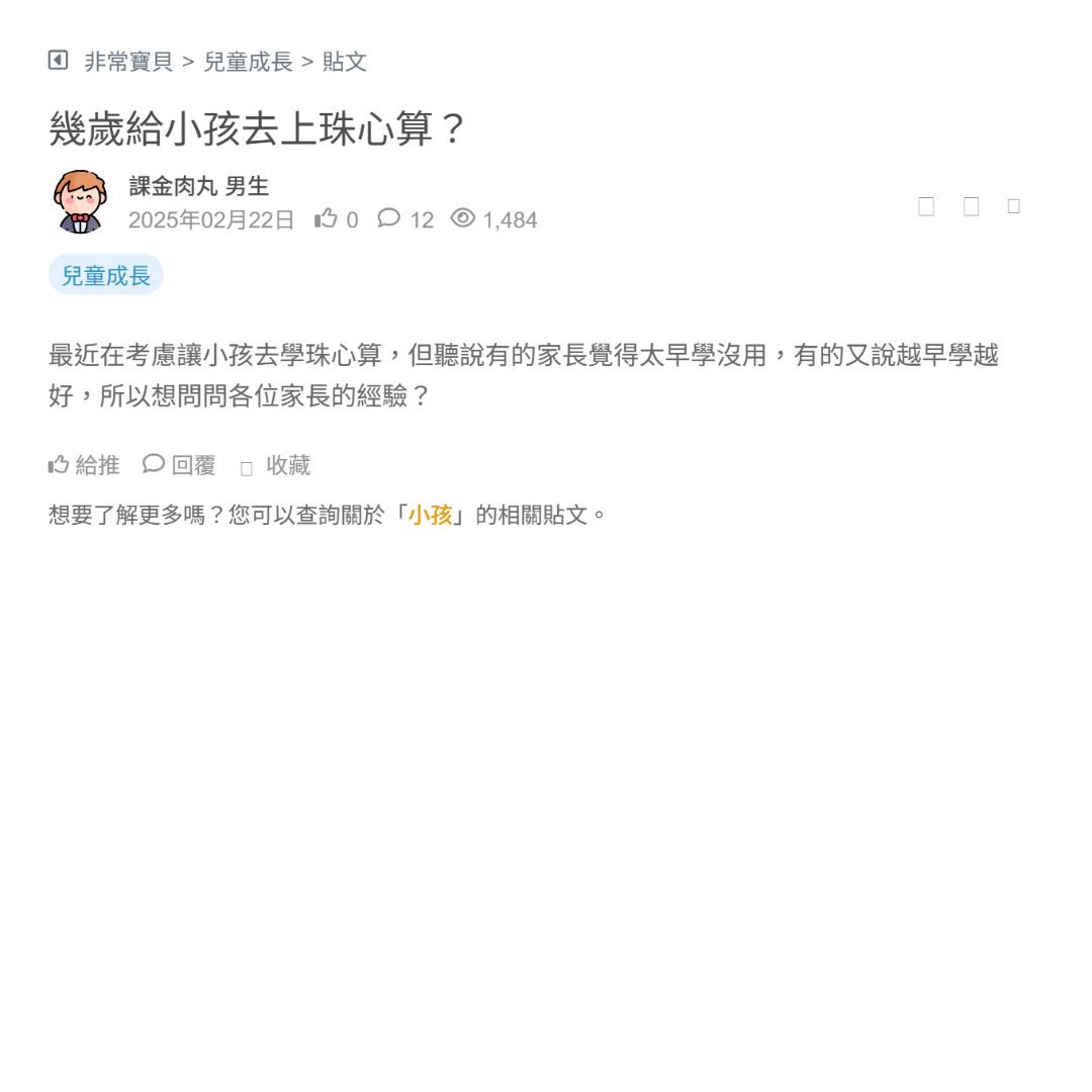 最近在考慮讓小孩去學珠心算,但聽說有的家長覺得太早學沒用,有的又說越早學越好,所以想問問各位家長的經驗?