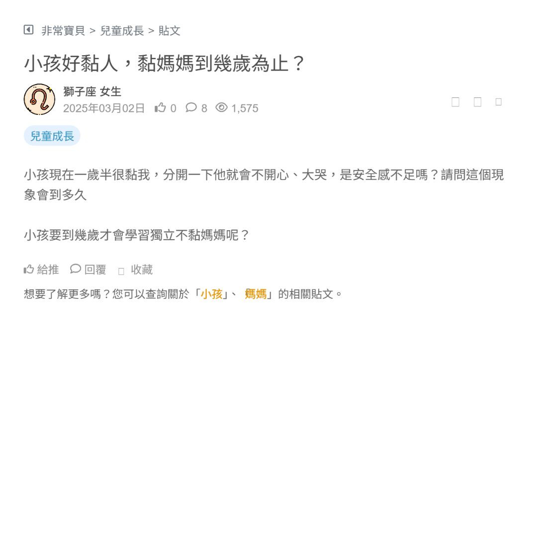 寶寶突然變超黏,原本可以給阿公抱,現在只要我一走就哭到崩潰,是階段性嗎QQ 看更多