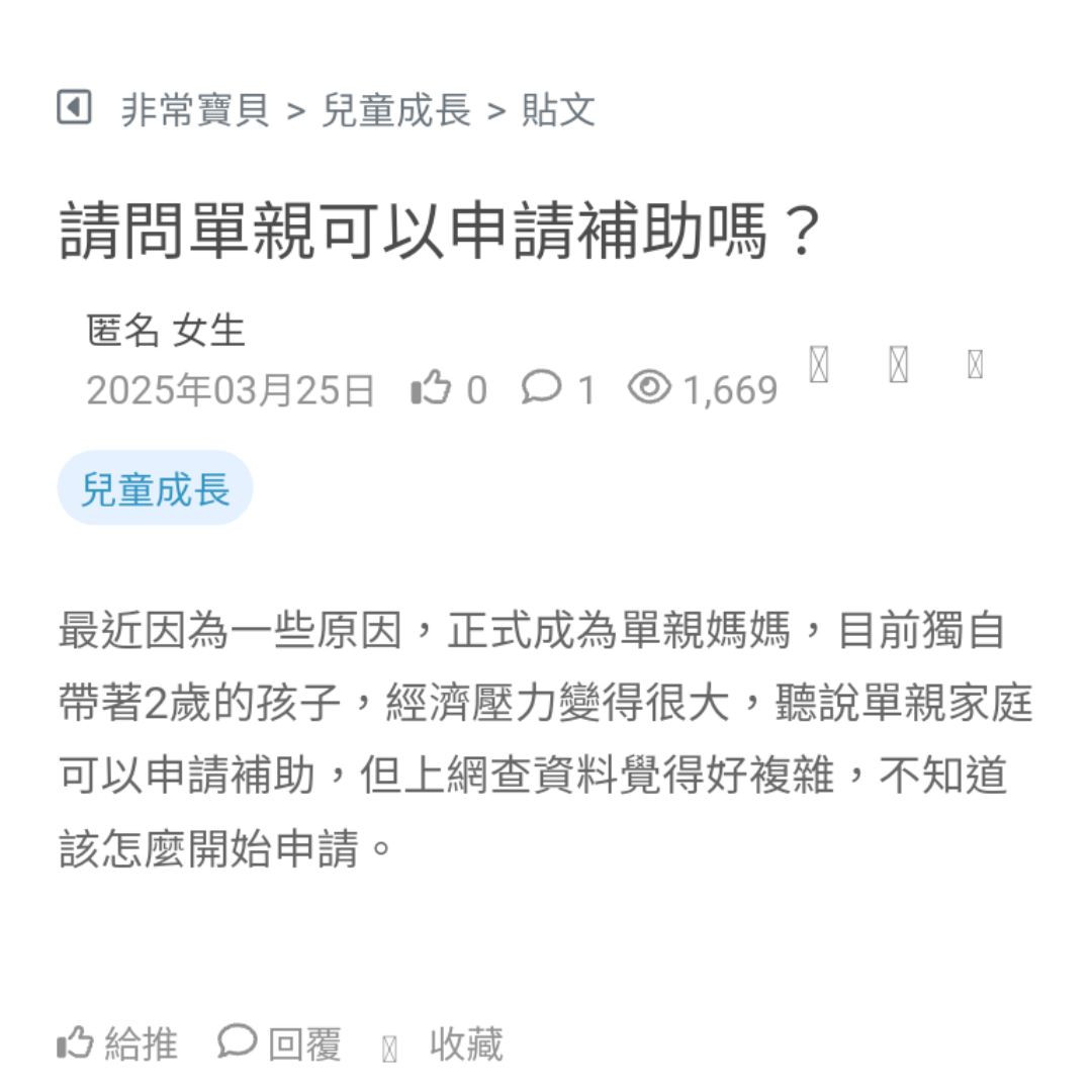 最近因為一些原因,正式成為單親媽媽,目前獨自帶著2歲的孩子,經濟壓力變得很大,聽說單親家庭可以申請補助,但上網查資料覺得好複雜,不知道該怎麼開始申請。