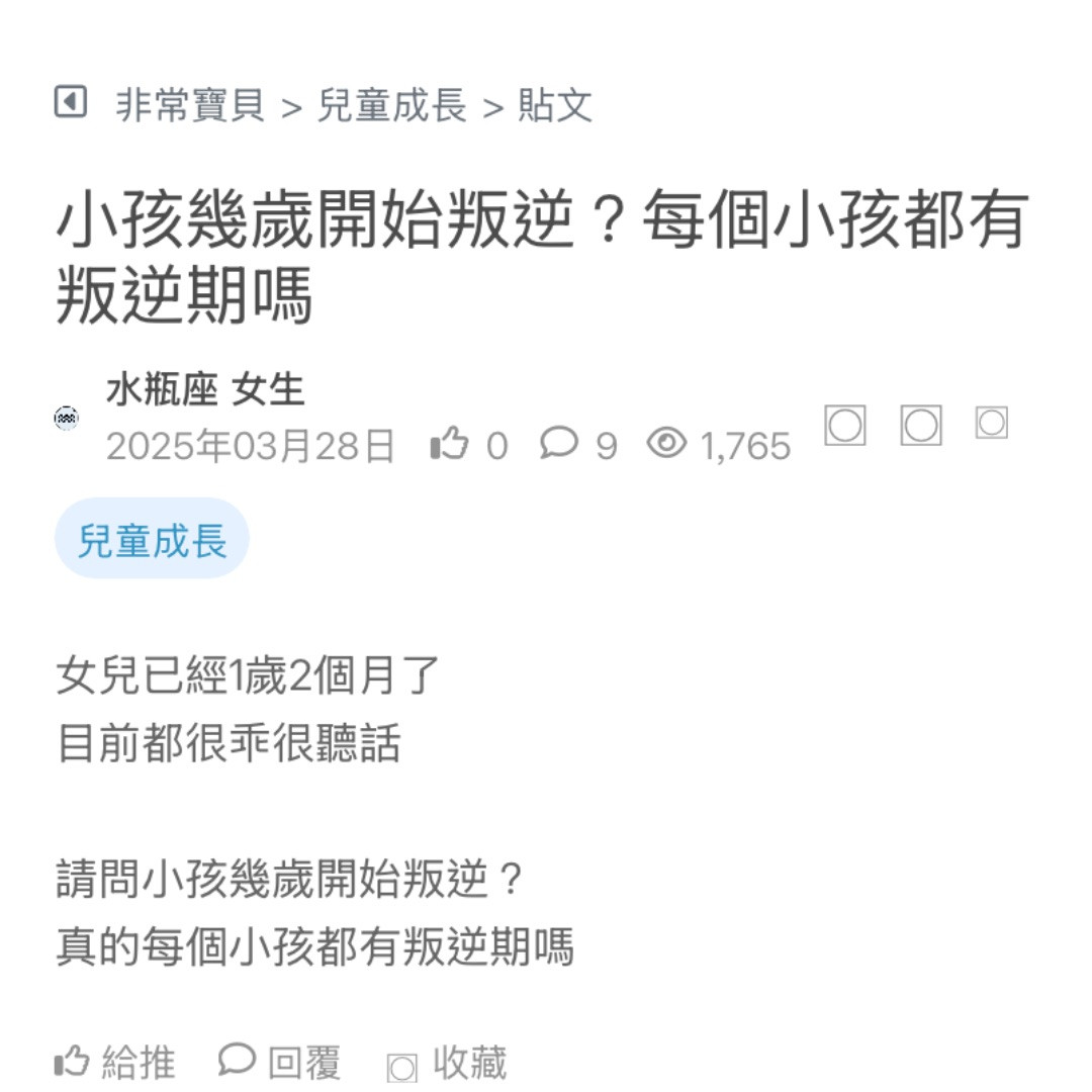 1歲8個月前都算溫和的 還看不出來 我女兒2歲6個月 正在經歷叛逆期 超難管 脾氣超大 每天家裡都快被翻起來…