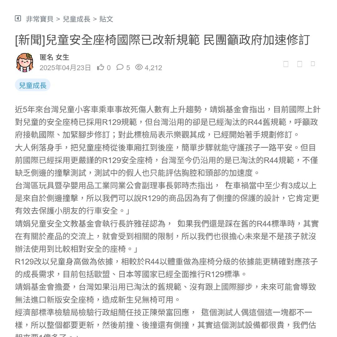 [新聞]兒童安全座椅國際已改新規範 民團籲政府加速修訂