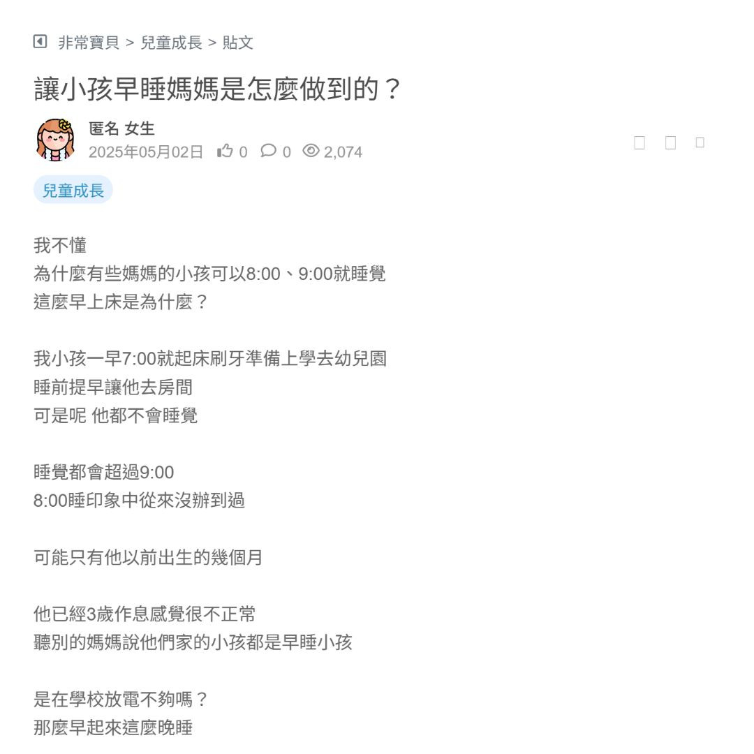 為什麼小孩那麼難哄 過了快一個小時才想睡覺 我哄了快虛脫 快累屎掉了….. 以為喝完奶就睡了 又再拖30分鐘 加一加快一小時 中間好生氣 好想罵他 但我忍住 有幾次大聲但都是在哄 我唱歌 輕輕的摸都沒用 小孩在床上滾了好久 滾來滾去 頭好痛🤕 身心俱疲 好累😞 內心好悶 我現在想好好睡一覺 但小... 看更多