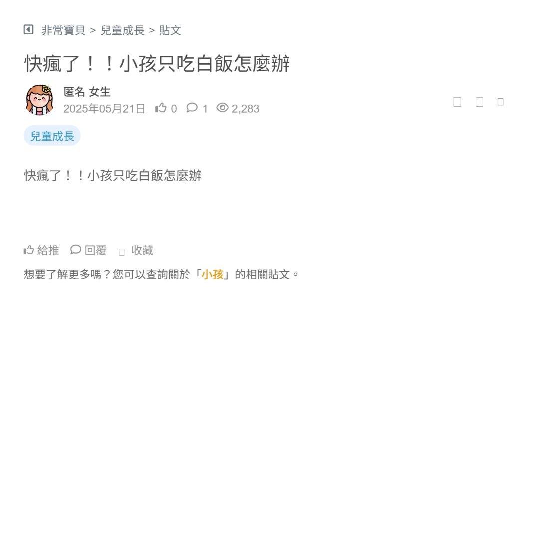 我女兒海鮮、肉、菜都不碰 只有白飯願意吃 給他加東西就整碗不吃 好難搞 試了好幾次都這樣 媽媽快無解了 看更多