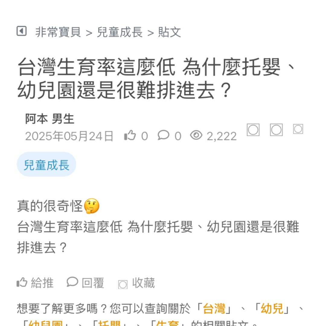 跟我朋友去參觀托嬰中心後內心只有一個想法 好恐怖 全部都是嬰兒的哭聲 喊叫 有幾個嬰兒歇斯底里的大哭 媽媽生完小孩一堆家長就把剛出生的小孩關在這種環境 托嬰老師介紹說這個6個月 這個2個月 靠杯 是2個月的嬰兒欸!!! 大家都幾歲把小孩送托嬰? 不會是2個月吧 大人都受不了待在如此惡劣的環境 還要求小孩要待... 看更多