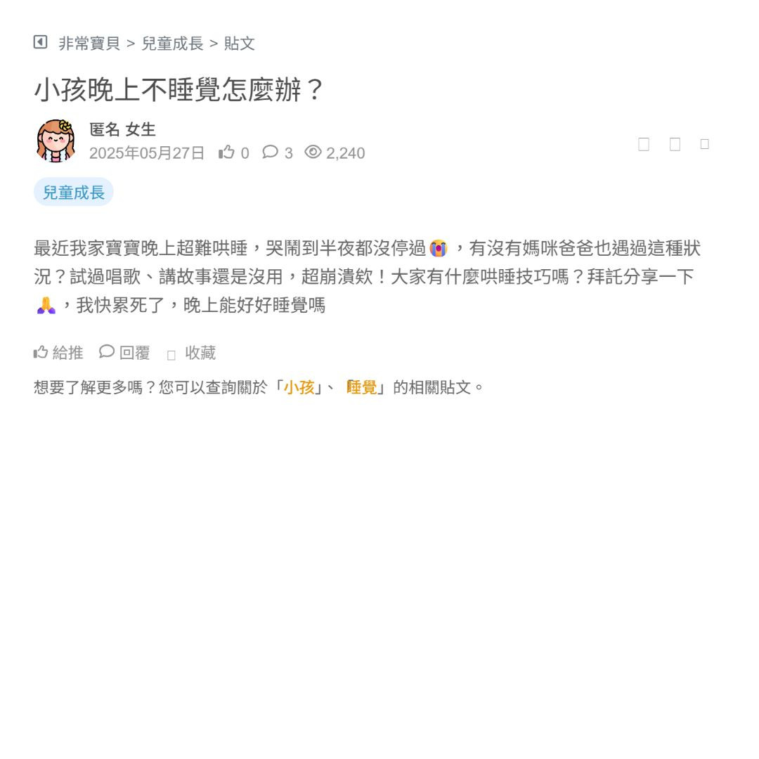 最近我家寶寶晚上超難哄睡,哭鬧到半夜都沒停過😭,有沒有媽咪爸爸也遇過這種狀況?試過唱歌、講故事還是沒用,超崩潰欸!大家有什麼哄睡技巧嗎?拜託分享一下🙏,我快累死了,晚上能好好睡覺嗎