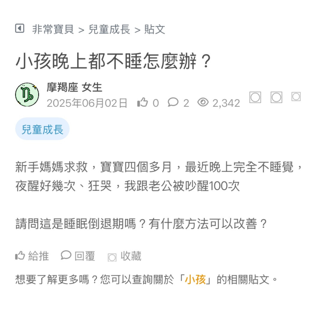 真的好佩服可以生超過兩胎的媽媽 我一胎生完已經快不行 寶寶好想哭半夜醒來反覆 當媽媽後8.9個小時長睡眠時間都沒有了 變得支離破碎 3個月寶寶怎麼那麼難哄睡 有什麼妙招讓嬰兒早點睡 幫幫我 😭 看更多