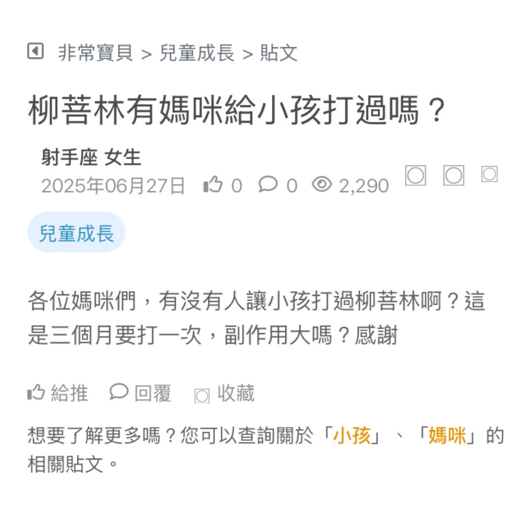 各位媽咪們,有沒有人讓小孩打過柳菩林啊?這是三個月要打一次,副作用大嗎?感謝