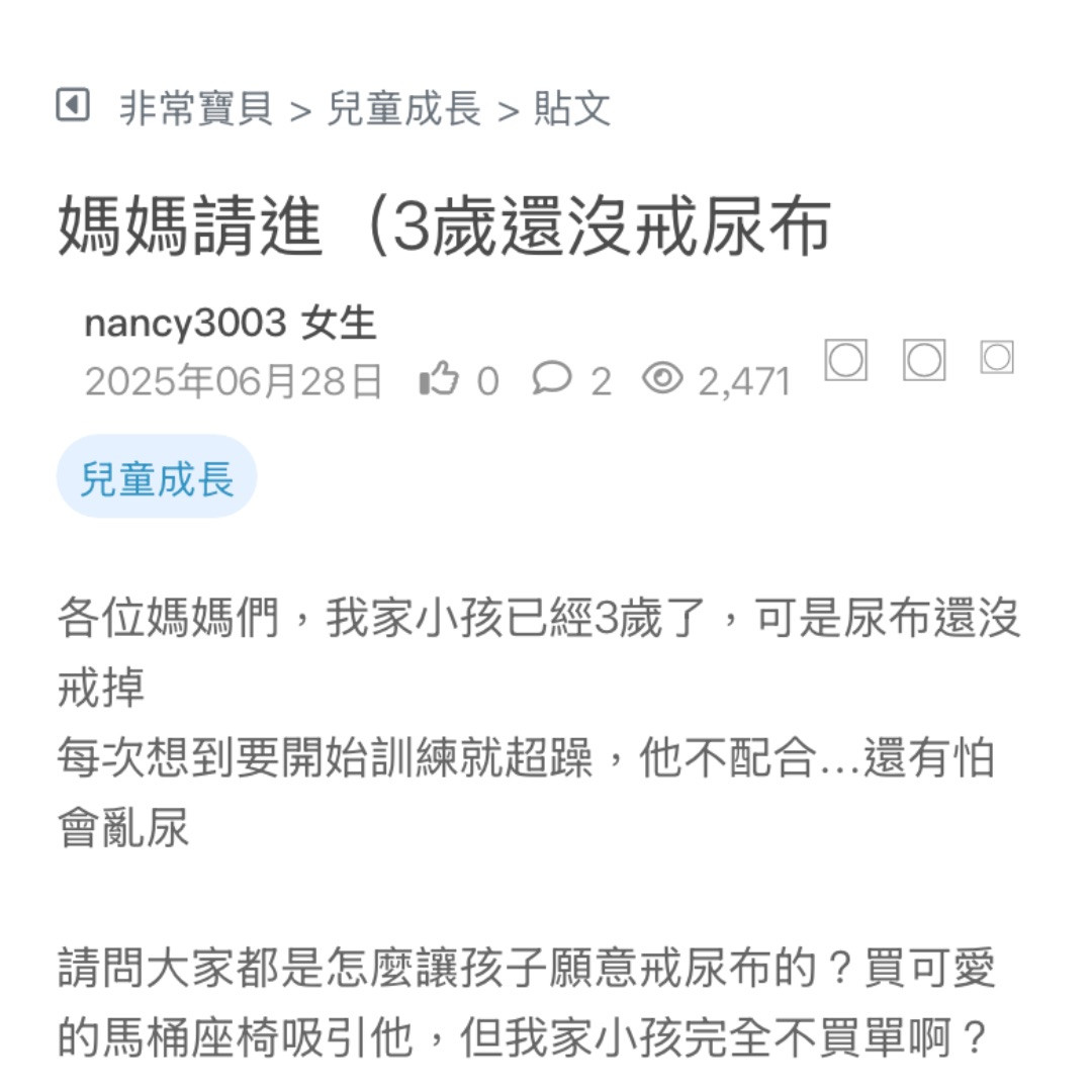 各位媽媽們,我家小孩已經3歲了,可是尿布還沒戒掉
