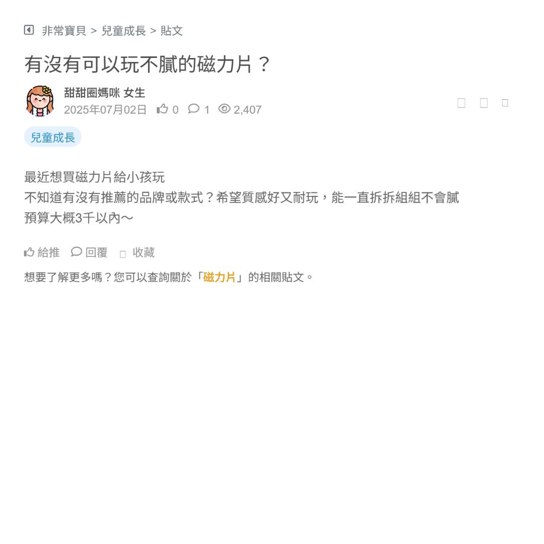 最近買了ㄧ組磁力棒給小朋友玩,超失望!磁力超弱 組合起來一下就掉超沒用 我老公狂笑我「你很衰小又買到劣質產品⋯⋯」 我內心:「沒錯…這個男人是我嫁的人(默念三次)」 我就是那種每次看便宜就莫名其妙😕買到爛貨的人 是說我哪有預知能力 求各位媽咪有沒有推薦好玩厲害的磁力棒 不會再被笑的 看更多