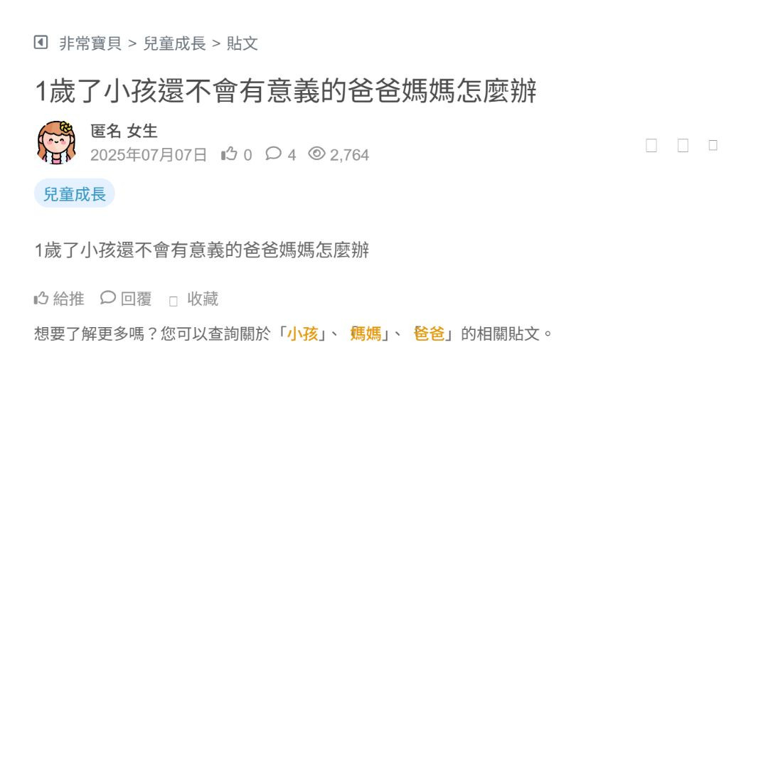 寶寶8m20d了 平常會亂叫 但還不會叫爸爸或媽媽 聽到大人的聲音會轉過頭來看 但是不會說單字 上個禮拜帶她去看醫生 醫生說是正常的 有一點擔心怎麼辦... 看更多