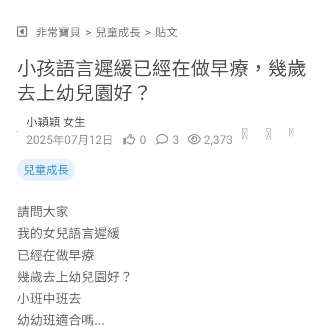 很多人在討論早療這個議題,想跟大家分享我的看法。早療,其實很多人一聽到就覺得好像是貼標籤、讓孩子被歧視的開始,可是我覺得不是這樣。早療的目的,其實就是要幫助孩子能夠早點追上其他同齡的小朋友,不要因為發展上的差異而被丟下,這才是重點。 從我身邊的例子很多家長剛開始聽到需要早療,內心都會掙扎,怕別人怎... 看更多