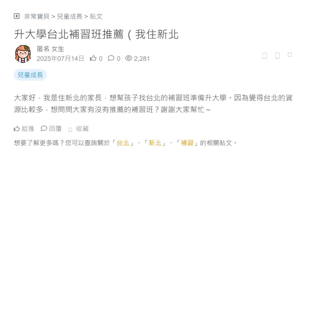 大家好,我是住新北的家長,想幫孩子找台北的補習班準備升大學。因為覺得台北的資源比較多,想問問大家有沒有推薦的補習班?謝謝大家幫忙~