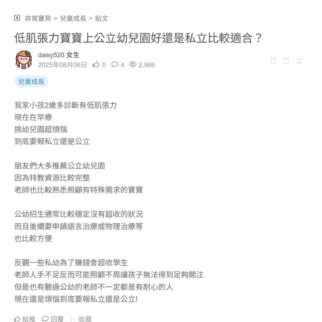 低肌張力寶寶上公立幼兒園好還是私立比較適合?