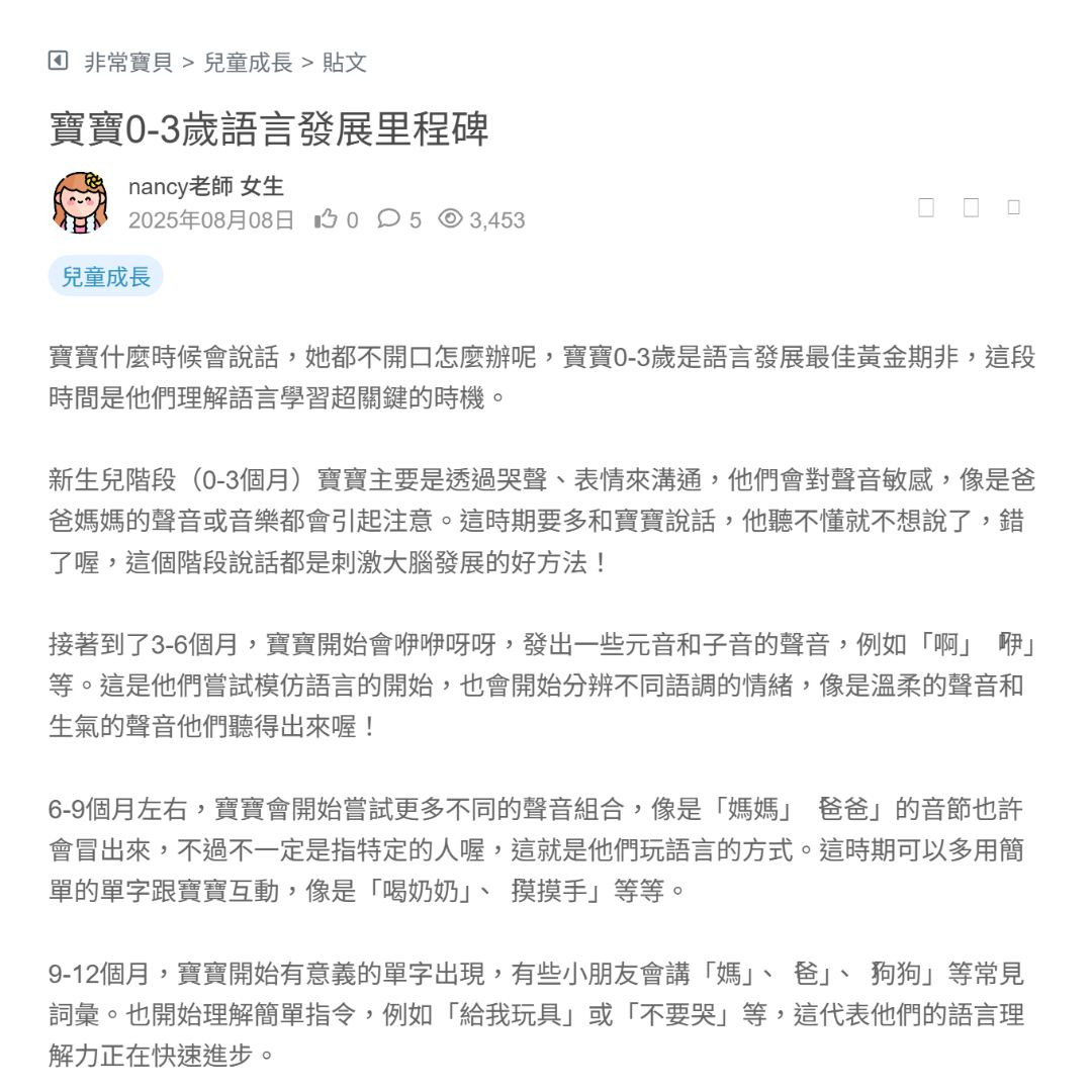 最後提醒一下,如果爸媽發現寶寶在任何階段語言發展明顯落後,例如不會發聲、不會模仿、不懂簡單指令,都建議早點找專業醫師或語言治療師評估,早期介入真的很重要。