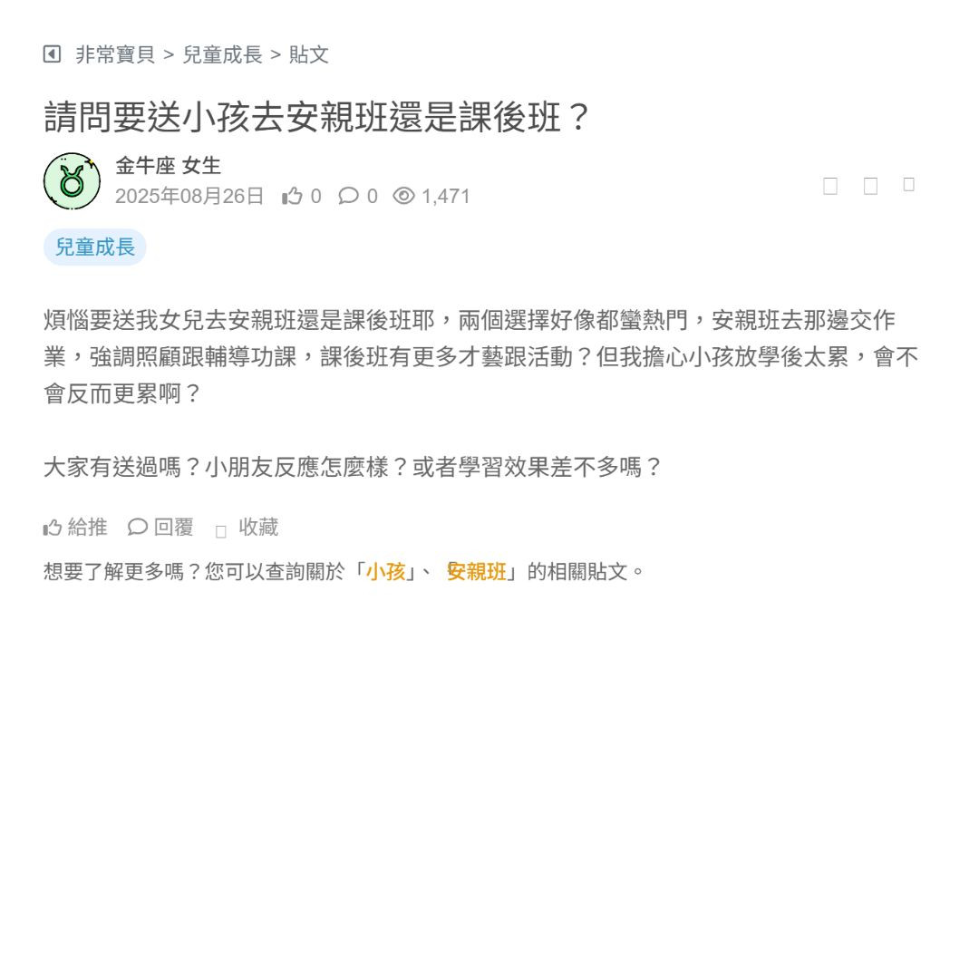 請問爸媽要上班沒後援的,是只能送安親班嗎?有別條路可選嗎? 看更多