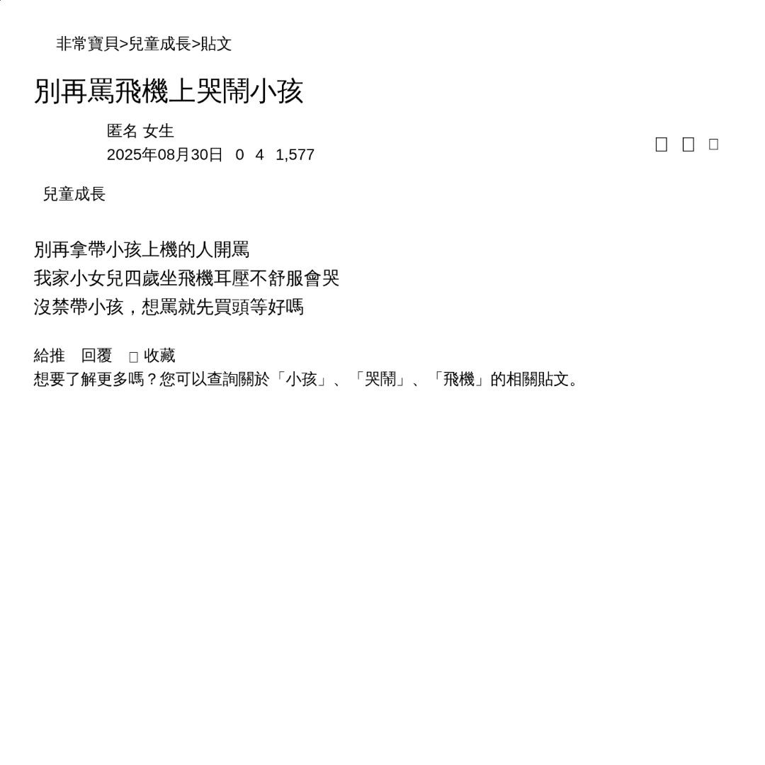 那一天我在飛機上 被其他旅客指責 說小孩子一直在哭鬧我怎麼不管好 可是我小孩只哭不到一分鐘 我們哄了講了盡力了 不知道是不是這一輩的人都不生小孩的緣故 或...