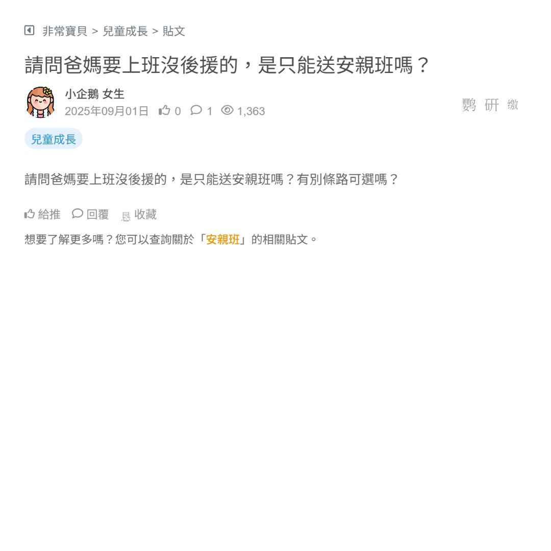 請問爸媽要上班沒後援的,是只能送安親班嗎?有別條路可選嗎?