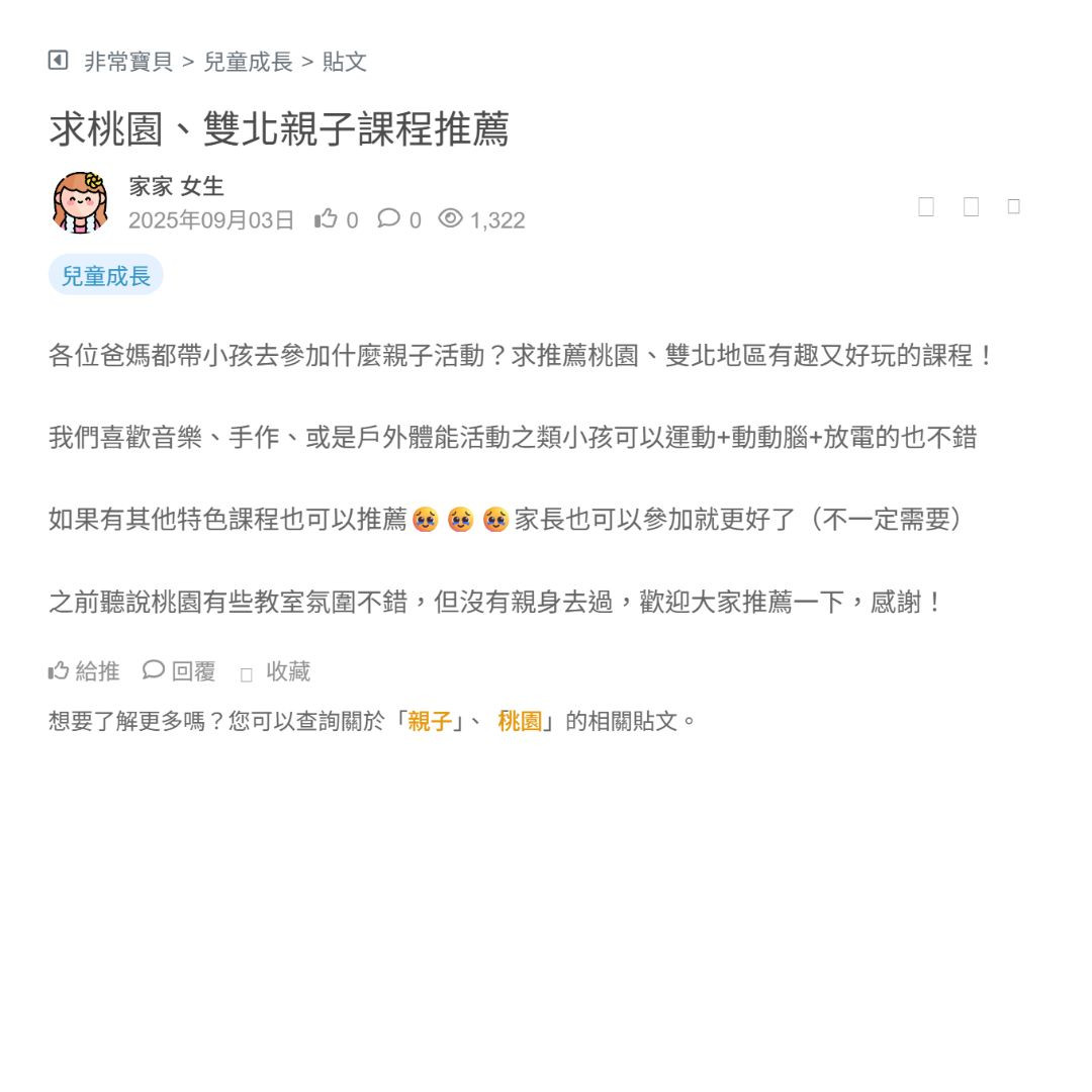 有沒有推薦的親子課程呢? 竹北、桃園、中壢、平鎮地區的都可以 看更多