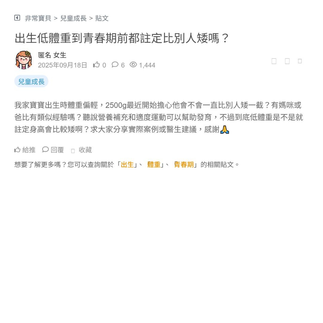 我家寶寶出生時體重偏輕,2500g最近開始擔心他會不會一直比別人矮一截?有媽咪或爸比有類似經驗嗎?聽說營養補充和適度運動可以幫助發育,不過到底低體重是不是就註定身高會比較矮啊?求大家分享實際案例或醫生建議,感謝🙏