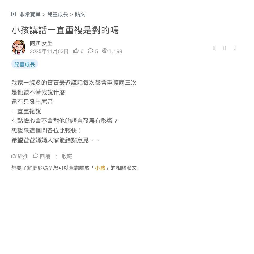 女兒還不到2歲 這陣子發出一些很奇怪的聲音 聽起來很怪 或是重複🔁循環一個 學講話的方式 讓我覺得有點怪怪的 後來給親戚聽 他們也覺得蠻驚嚇的 每天都...
