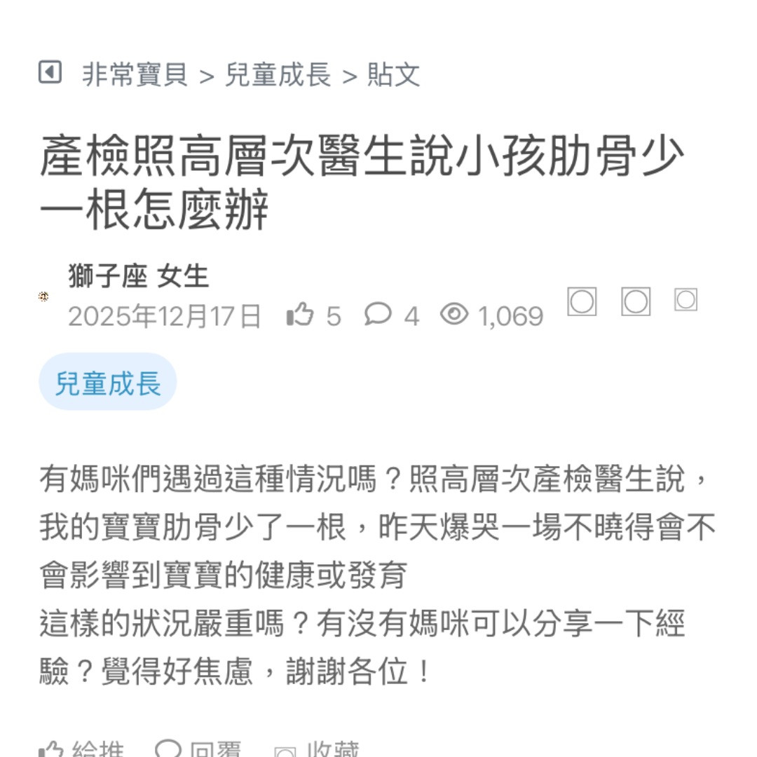 有媽咪們遇過這種情況嗎?照高層次產檢醫生說,我的寶寶肋骨少了一根,昨天爆哭一場不曉得會不會影響到寶寶的健康或發育