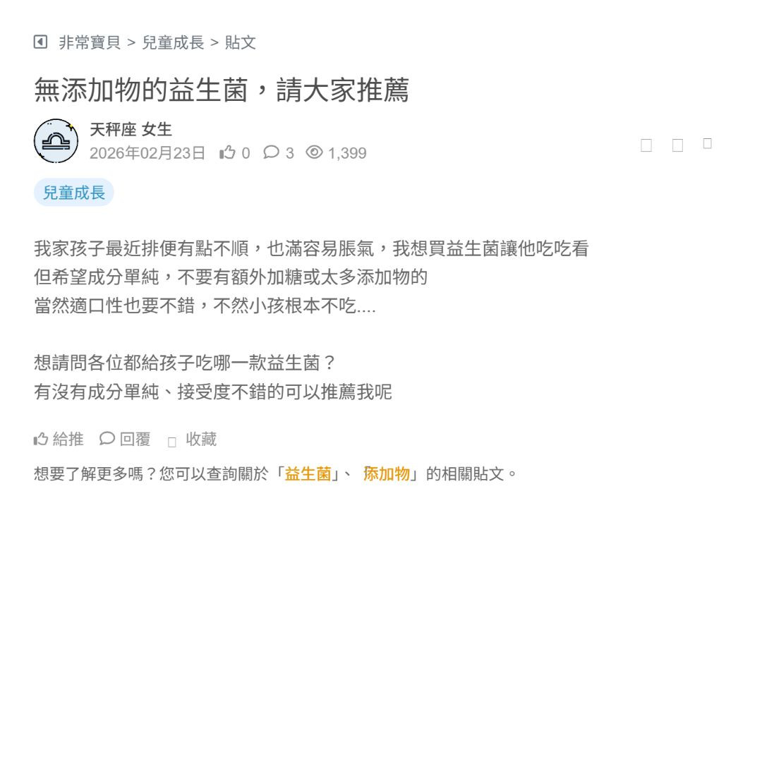 我家小朋友最近便秘嚴重,之前我有買過成人益生菌,怕成分或劑量不適合小孩,想找專門針對兒童設計的,天然不想添加香料、糖分過高,有甜味劑之類的,請問都怎麼挑選的呢?有推薦的品牌或口味都可以告訴我,感謝大家了! 看更多