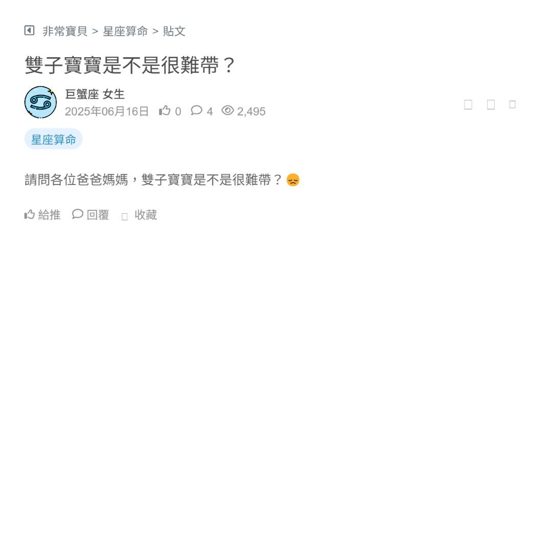 最近朋友跟我說他寶寶是雙子座,我整個心裡OS:完蛋了… 雙子太難搞了吧,聽說很難管+容易鬧脾氣 以後家裡要大戰三百回合… 大家有沒有覺得某些星座寶寶超難...