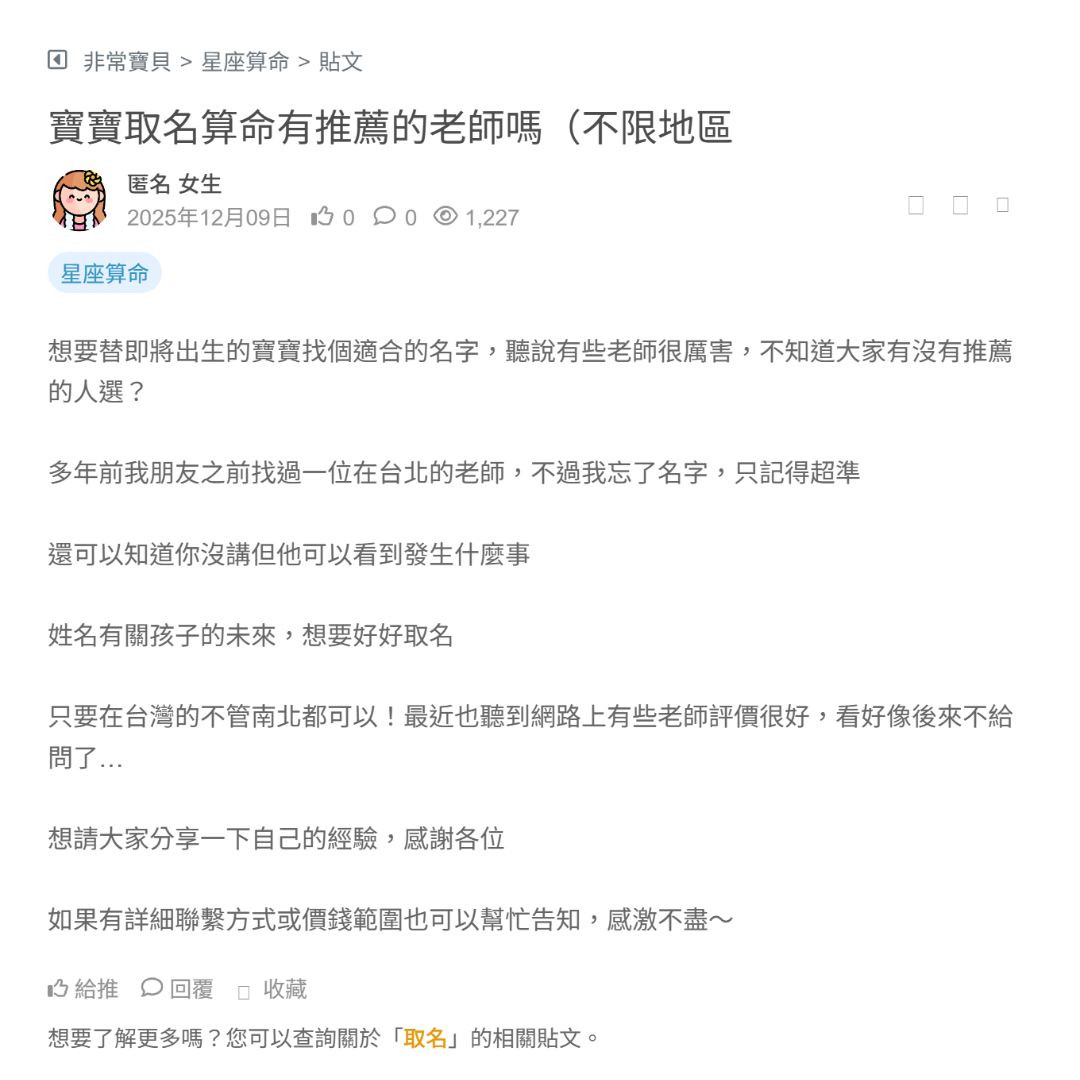 請問板上有人知道台北有哪些很靈的算命師父嗎? 我沒有特殊信仰,只是想幫肚子的女寶寶取名~感謝 看更多