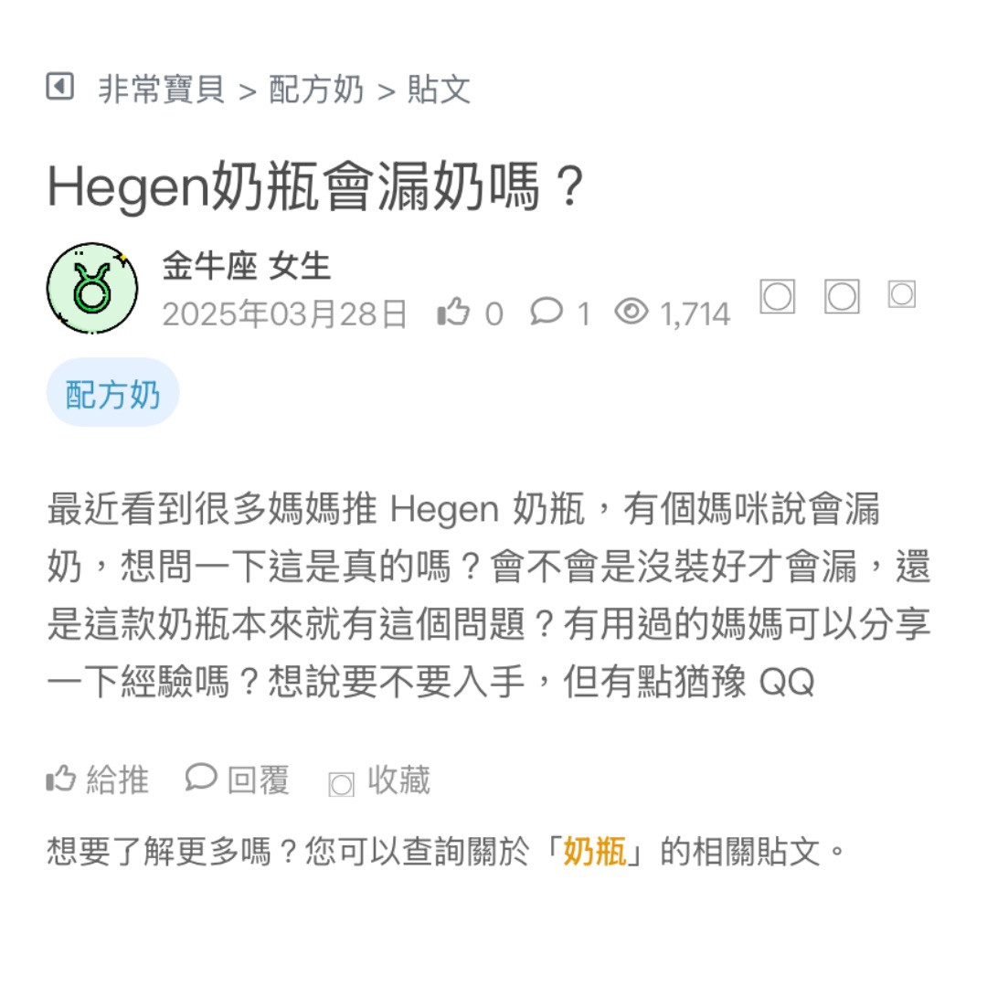 最近看到很多媽媽推 Hegen 奶瓶,有個媽咪說會漏奶,想問一下這是真的嗎?會不會是沒裝好才會漏,還是這款奶瓶本來就有這個問題?有用過的媽媽可以分享一下經驗嗎?想說要不要入手,但有點猶豫 QQ