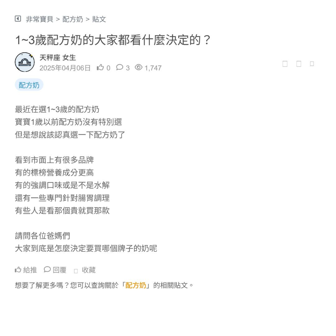 小弟我最近剛榮升為新手爸,正在苦惱該選擇哪款配方奶給寶寶...😅 市面上品牌價格差異很大,有沒有推薦哪一款,以及選擇時需要注意哪些成分或事項呢? 另外,有沒有人可以分享過自家寶寶吃了某品牌配方奶後的成長經驗?生長曲線身高體重的狀況,感覺還有好多不懂的地方,請大家多多指教 看更多