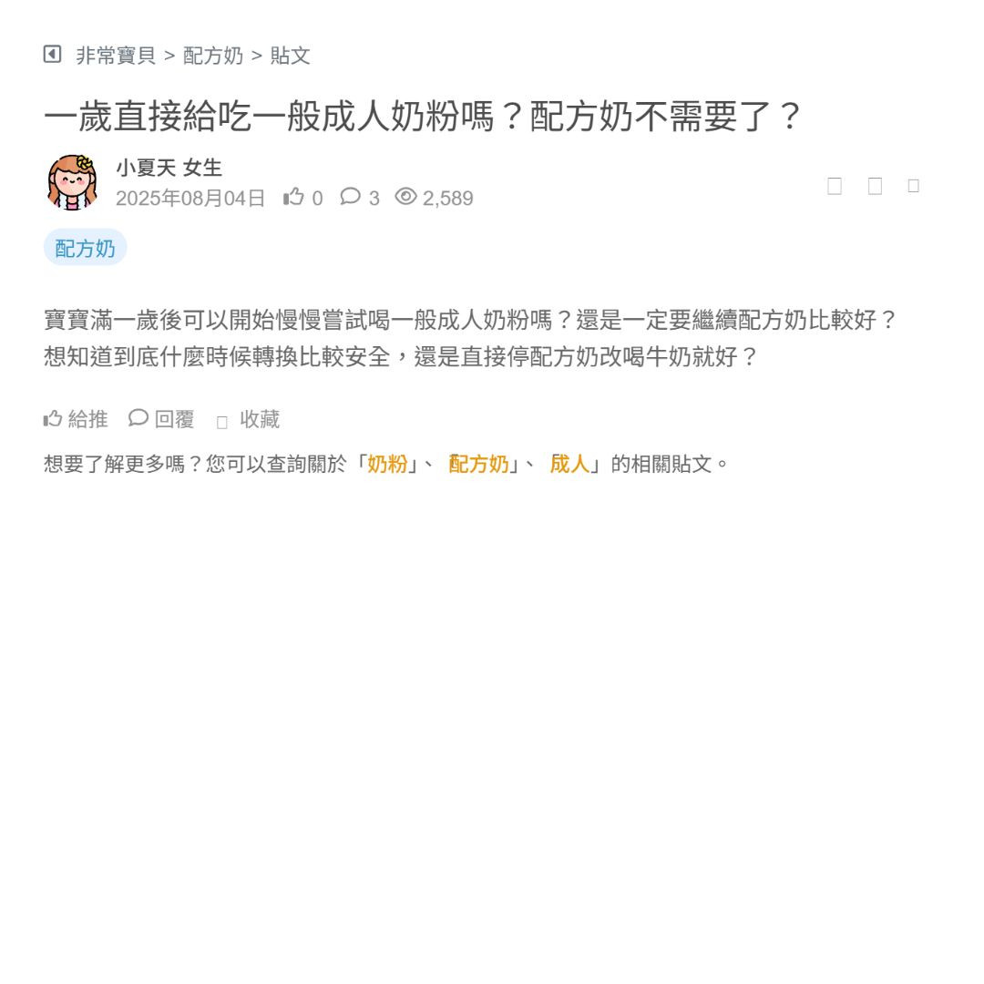 當寶寶需要喝配方奶時,市場上的品牌超多,該怎麼選才不會踩雷? 有些強調接近母乳,有些主打水解蛋白,還有些專為腸胃敏感寶寶設計。這篇就來一次解析不同需求的配方奶推薦,幫爸媽們做功課! 🍼 配方奶怎麼選?這幾點超重要! ✅ 年齡分階:有新生兒(0-6個月)、較大寶寶(6-12個月)甚至 1 歲以上幼兒奶粉,選對... 看更多
