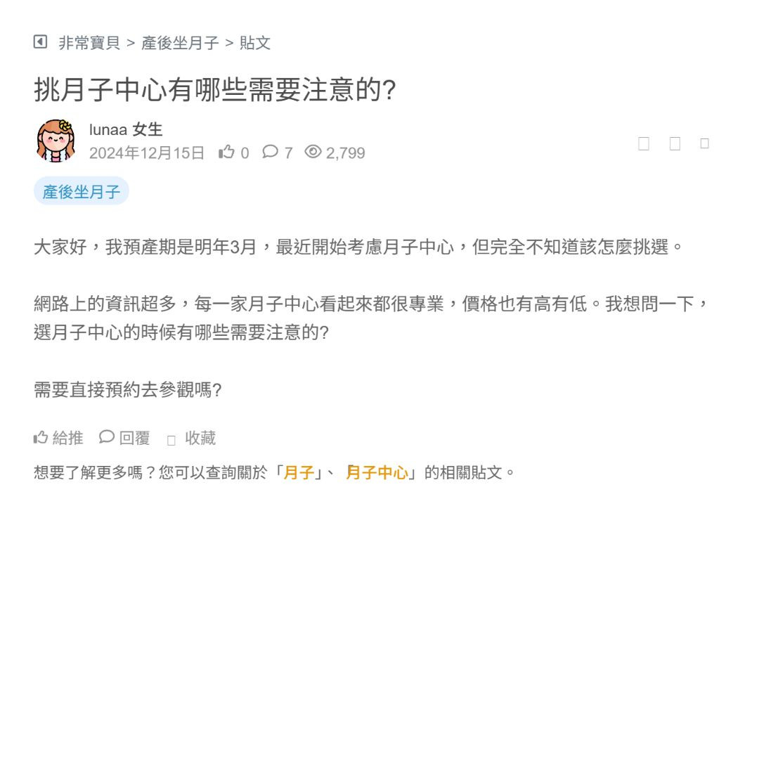 懷孕6個月 我還沒找到理想的月子中心 朋友都說要趕快找 不然到時候都沒位子就開天窗 只是桃園不知道要選哪間 之前有找過幾家 有發現網路一些評價不錯蠻...
