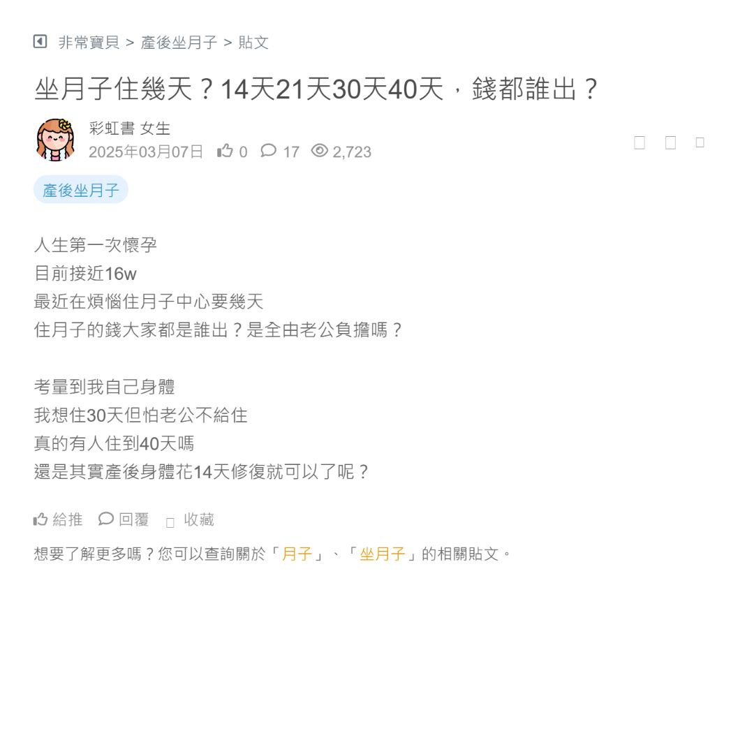 想要了解更多嗎?您可以查詢關於「月子」、「坐月子」的相關貼文。