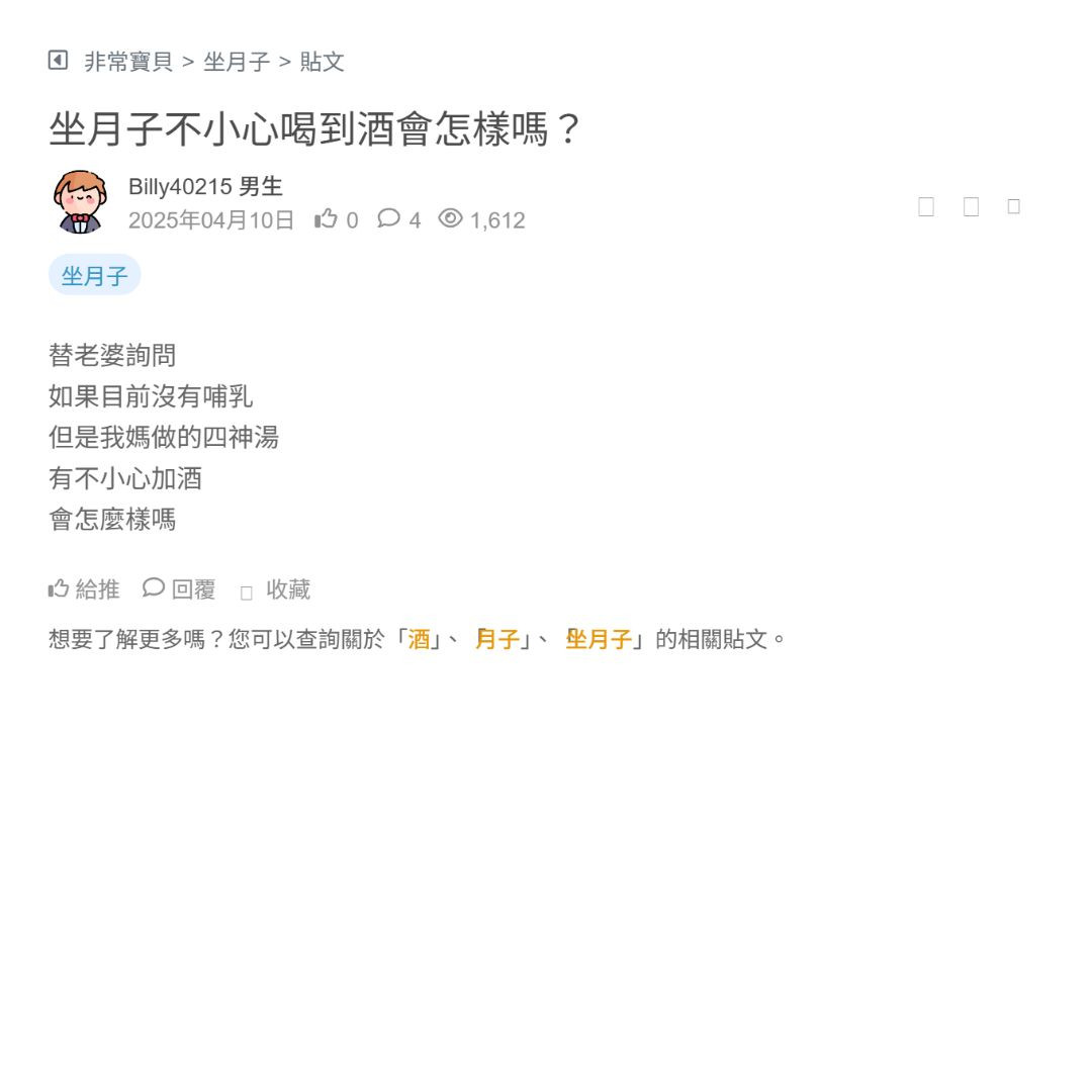 上週末跟公司同事一群人去慶生 聚餐以後比較熟的幾個加我一起去酒吧續攤 我點的酒🍷一小杯而已 但濃度我不知道 沒想到隔不到一個禮拜驗出肚子裡有小寶寶 我先生震怒 還幾度飆髒話罵我罵的很難聽 「難道不知道現在不能喝酒嗎」 可是我推算不會在這個時間懷孕 所有放心喝 沒想到覺得有異狀 去驗才發現慘了竟然寶寶選擇在這時... 看更多