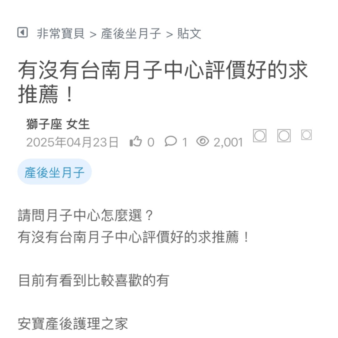 台南東區貝詩特產後護理之家有媽咪住過嗎?目前在找月中,這間離我們家近,老公說離家近的月中比較好,有需要就回家拿東西,或他下班偶爾可以回家吃飯,請問月中...
